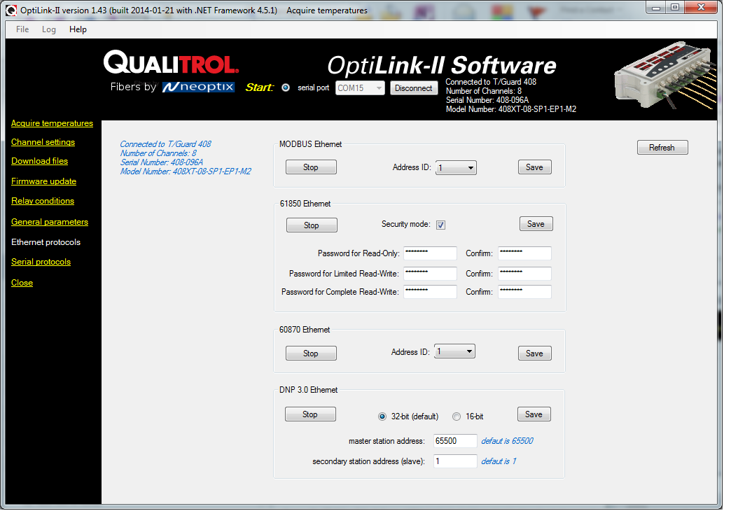 The T/Guard 405 system is easy to interface to an existing marshaling or substation system via its 4-20 mA analog outputs (0-10 Volts optional) or its MODBUS communication interface. When used with the optional Neoptix OptiLink™ software on the serial port, the T/Guard becomes an indispensable monitoring instrument.