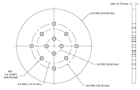 The tank wall plate accommodates from 1 to 24 optical feedthroughs and is supplied with plugs to close unused holes. It comes standard with 1/4 NPT ANSI threads.